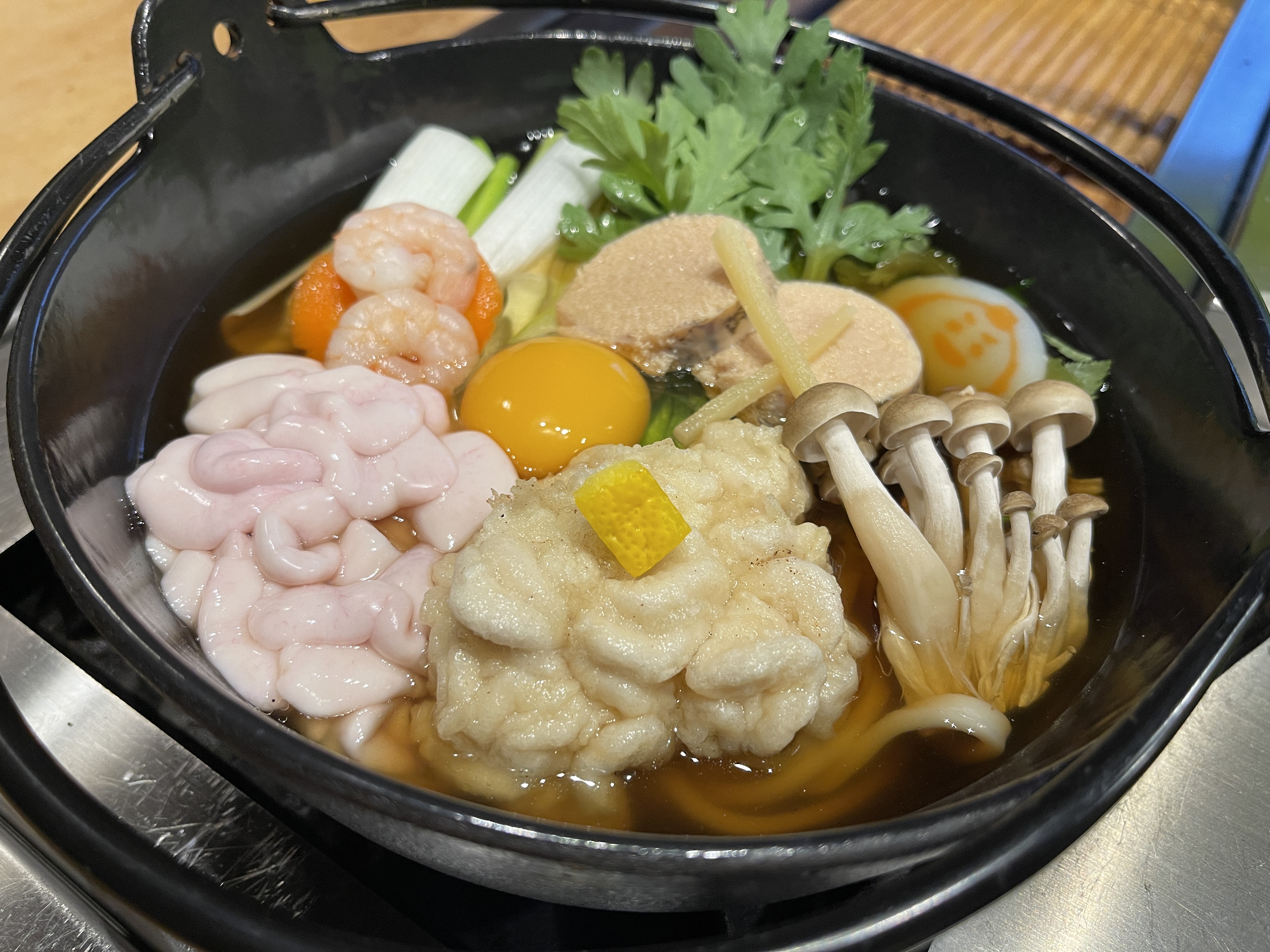 【白子うどん鍋 真子添え】寒くなると白くてトロトロとしたものが無性に食べたくなりますうどんのあとのおじやと真子のプチプチも最高です・・・口福!白子、白子てんぷら、真子などが入ります。12/1より冬期限定¥3580税込単品:あげ出し白子(\1280税込)もご用意しております。